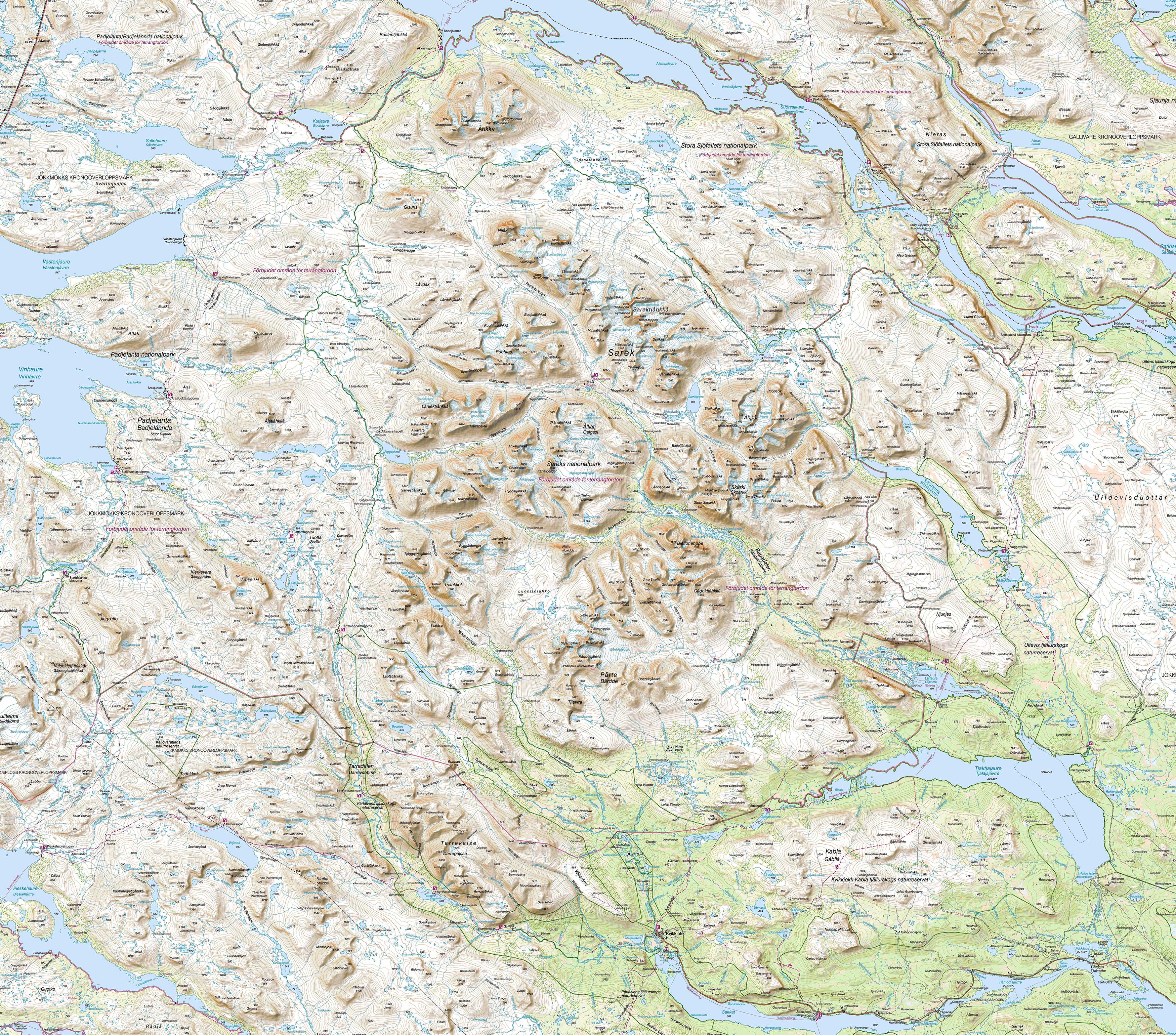 Das wilde Sarvesvagge ist im Unterlauf des Sarvesjáhká bei Wanderern gefürchtet durch sein undurchdringliches Weidendickicht und viele sumpfige Stellen. Das Tal verläuft vom Padjelanta bis zum Rapadalen. Oben am Padjelanta eine grosse flache Ebene geht es eher gemächlich nach oben zum höchsten Punkt. Dort einige kleinere Blockfelder, aber keine Schwierigkeit.